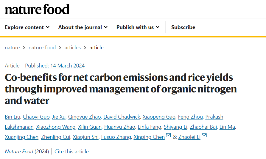 3月14日,西南大学陈新平团队联合国内外多所高校在《自然-食物》期刊(Nature Food) 在线发表了题为“协同实现净碳减排和水稻增产的有机氮肥与水分综合管理”(Co-benefits for net carbon emissions and rice yields through improved management of organic nitrogen and water)的论文,揭示了稻作区有机替代对水稻产量和温室气体排放的影响,提出了稻作区基于有机替代的增产减排综合水肥管理策略,为协同实现全球水稻产能提升和净碳减排提供了基于自然解决方案的路径。