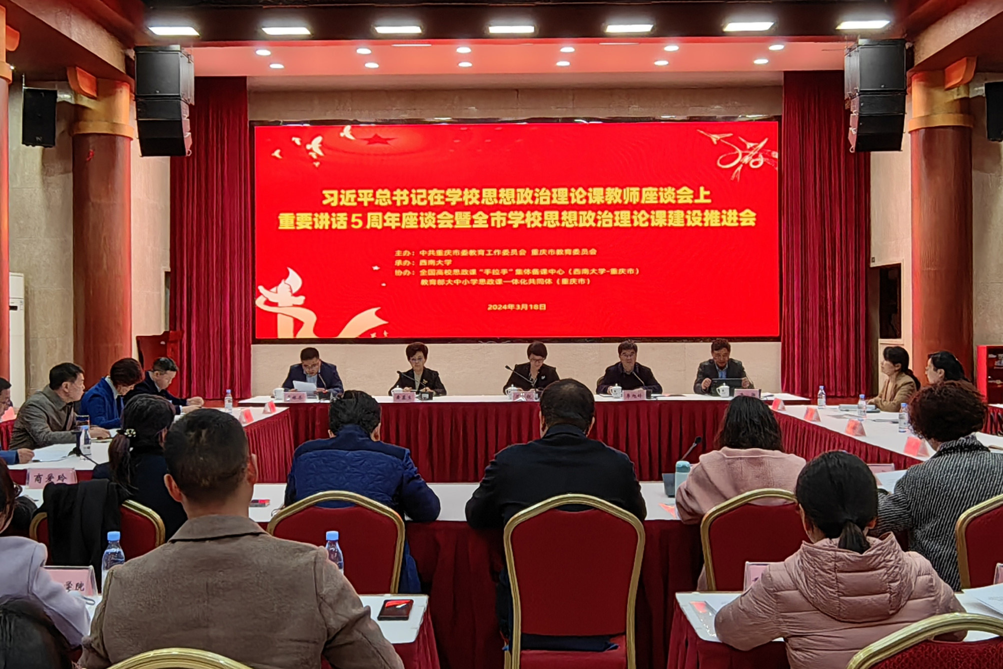 为深入贯彻落实习近平新时代中国特色社会主义思想,切实推进重庆市学校思政课建设,3月18日,习近平总书记在学校思想政治理论课教师座谈会上重要讲话5周年座谈会暨全市学校思想政治理论课建设推进会在西南大学召开。会议由中共重庆市委教育工作委员会 重庆市教育委员会主办,西南大学承办,全国高校思政课“手拉手”集体备课中心(西南大学-重庆市)、教育部大中小学思政课一体化共同体(重庆市)协办。市委教育工委专职副书记屈锐出席会议并讲话。会议由重庆市教委宣教处处长李林齐主持,来自重庆市各高校马克思主义学院负责人、相关代表共90余人参加了本次会议。