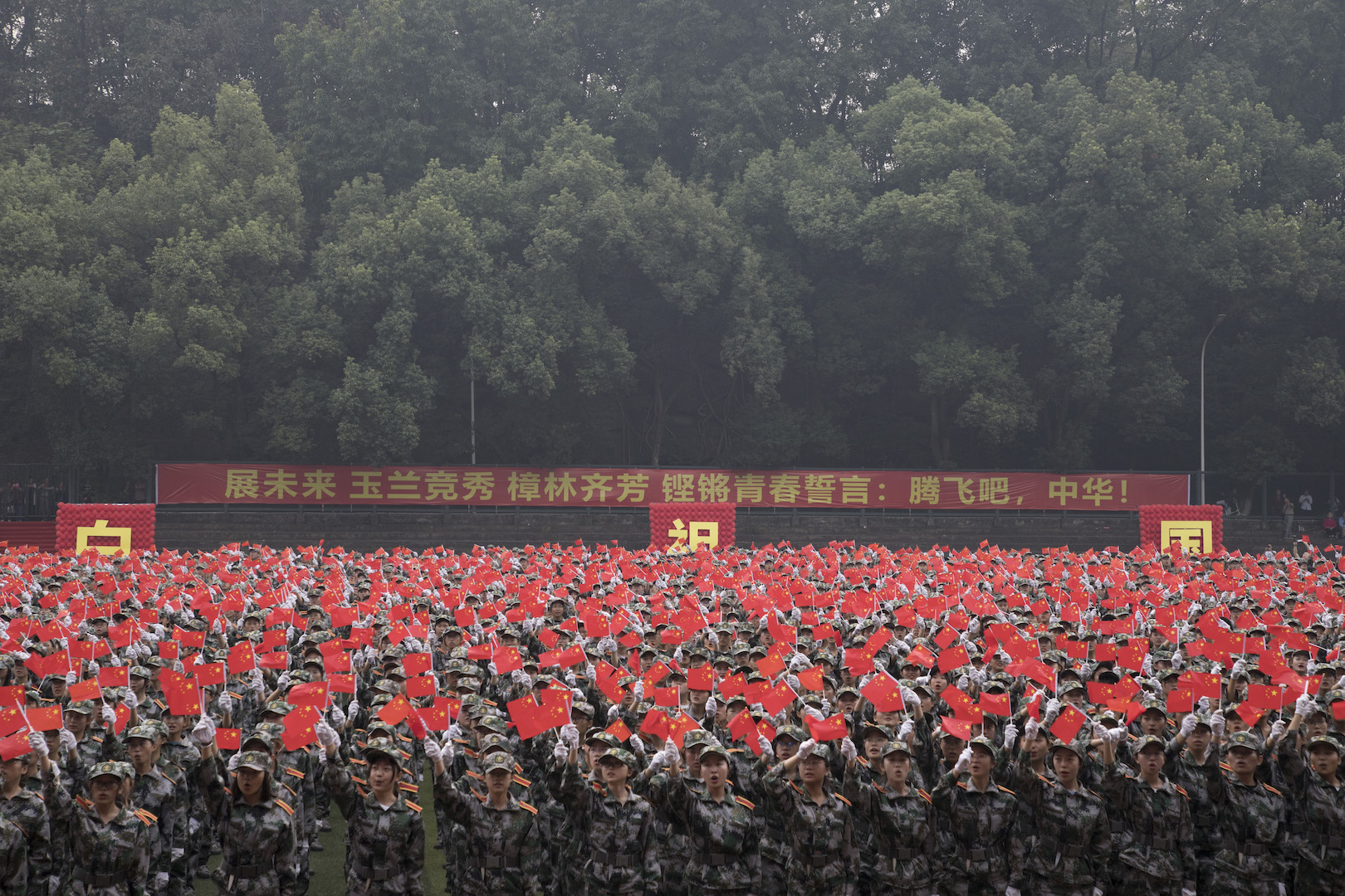 军训汇报表演队列操将庆祝活动推向高潮。不断变化的方阵和精心设计的图案,蕴含了西大学子对祖国的深深祝福,当“中国 70 1949-2019”字样出现在队列当中,全场师生为之沸腾。