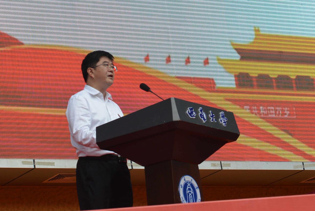 学校党委书记李旭锋发表讲话。“百余年来,西大人春风化雨,躬耕不辍,数十万毕业生从这里走向四面八方,成为民族复兴大业的建设者和各行各业的中坚骨干……未来的30年,同学们不仅要亲眼见证‘两个一百年’奋斗目标的实现,而且将作为生力军和主力军全程参与,这是一种光荣和骄傲,更是一种责任和担当。”李书记寄语广大青年向共和国勋章和国家荣誉称号获得者学习,坚守报国初心,用信仰的青春向祖国告白;勇担时代使命,用奋斗的青春向祖国告白;厚植为民情怀,用奉献的青春向祖国告白!锤炼品德修为,以真才实学服务人民,以创新创造贡献祖国,书写出无愧时代、不负人民的青春答卷。