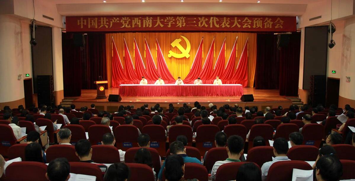 7月10日下午,中国共产党西南大学第三次代表大会预备会议在音乐学院演奏厅举行。党委书记李旭锋同志,党委副书记、校长张卫国同志,党委副书记安春元同志,党委副书记、纪委书记李华同志,党委副书记潘洵同志在主席台就坐,全体党代表参加会议。会议由李旭锋同志主持。
