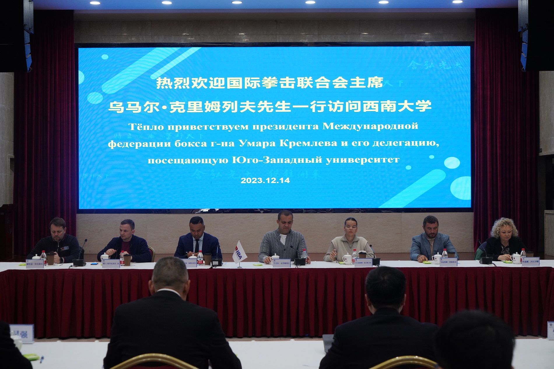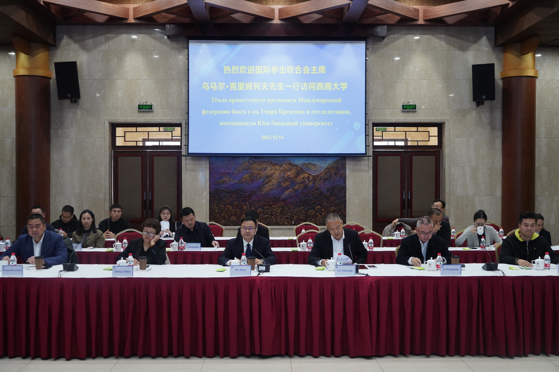 12月14日,国际拳击联合会主席乌马尔•克里姆列夫先生一行15人来校访问。市教委总督学吴边、市商务委二级巡视员张莉华、市国资委副主任李星强等有关部门领导同志陪同来访。副校长葛信勇会见来宾。党政办公室、国际合作与交流处和体育学院有关负责人参加会见。